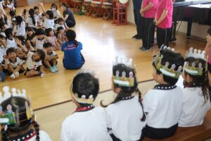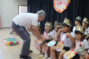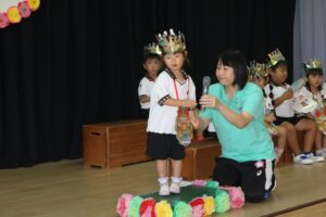 「9月生まれのみなさん、おめでとう!」 恒例のインタビューは、年少さん「好きなテレビ番組」(クレヨンしんちゃん、ドラえもんなど)、年中さん「好きなご飯屋さん」(ラーメン屋、お寿司屋など)、年長さん「好きなイベント」(クリスマス、花火大会など)でした。今月生まれの3人の先生にも子どもたちから質問がありました。