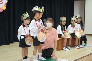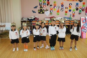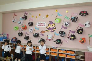 10月生まれの子は、7人。いつもの半数以下でした。みんなの前で質問(年少:好きな歌、年中:宝物、年長:魔法が使えたら)に答えていました。今月生まれの先生への質問は、「買い物はどこのスーパーに行っていますか」など、プライベート情報? ユニークな質問がありました。年長さんの部屋をのぞくと、ハロウィンの掲示がしてありました。(やっと、運動会前半をインスタ投稿にあげました)