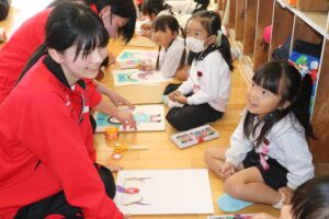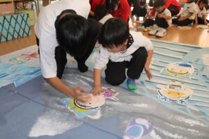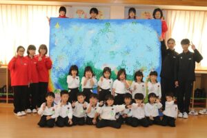 年中さんが済美高校美術科の生徒さんと共同制作を行いました。事前に大きな背景画を用意してくれていて、今日は一人一人の園児が絵を描いて貼る作業をしました。みんなで記念写真を撮りましたが、ここでは、作品全体はわからないように加工しました。12月の済美展(県美術館南館)でご覧ください。