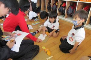 年中さんが遠足に行っているとき、年少さんは済美高校美術科1年生と共同制作をしました。(実は、このとき園庭ではマンダリンパイレーツの野球教室)年少さんは大型絵本を読んでもらい、それを題材に各自が絵を描き、みんなのを合わせて大きな作品にしました。これも12月の済美展に展示します。