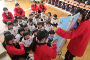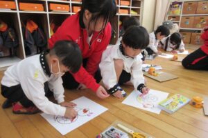年中さんが遠足に行っているとき、年少さんは済美高校美術科1年生と共同制作をしました。(実は、このとき園庭ではマンダリンパイレーツの野球教室)年少さんは大型絵本を読んでもらい、それを題材に各自が絵を描き、みんなのを合わせて大きな作品にしました。これも12月の済美展に展示します。