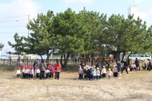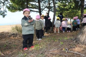 年少さんが、昼前、松前の海岸に松ぼっくり拾いに行きました。みんなで並んで、松ぼっくりの歌を歌って帰ってきました。この松ぼっくりは、クリスマスの飾り物やけん玉になる予定です。