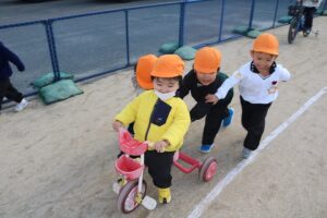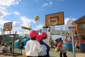今日はあまり寒くなく、日差しがあり、暖かくさえ感じるお昼前、子どもたちは、元気に園庭で遊んでいました。今月の目標は「寒さに負けず、戸外で元気に遊ぶ」。縄跳びの練習をしたり、バスケットシートをしたり、三輪車に乗ったり、砂場で遊んだり、石山滑りをしたり。1時間くらい園庭で過ごしました。