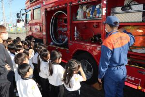 地震・火事を想定した避難訓練を行いました。消防署の方にも来ていただき、消火器の使い方の説明を受け、全職員の消火訓練も行いました。子どもたちは、消防車について説明を受け、最後は集合写真を撮りました。