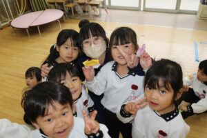 昨日に続き、別のクラスの生徒が来園し、子どもたち(年少・年中さん)に楽しい遊びを提供してくれました。フルーツバスケットをしたり、折り紙をしたり、赤白のカードをひっくり返す競争をしたり。「また、来てね。バイバイ。」