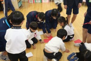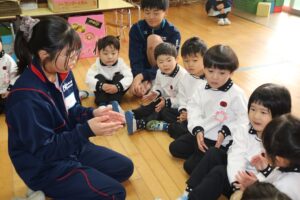 昨日に続き、別のクラスの生徒が来園し、子どもたち(年少・年中さん)に楽しい遊びを提供してくれました。フルーツバスケットをしたり、折り紙をしたり、赤白のカードをひっくり返す競争をしたり。「また、来てね。バイバイ。」