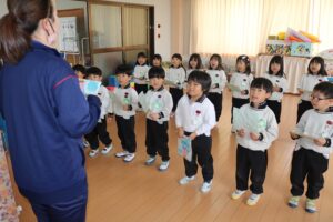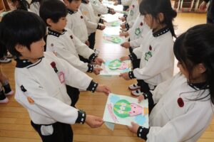 年中さんは卒園式に参加しないので、今日、年長さんへのプレゼントもってメッセージを届けました。プレゼントは、年長さんそれぞれが絵付けした砥部焼のお皿(卒園記念品)を入れる袋です。その袋のウサギの顔は、年中さんが描きました。まずは、年中さんの部屋で練習をして出発。「いっしょに遊んでくれてありがとう。小学校でもがんばってください。」