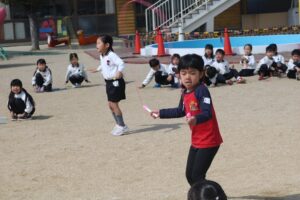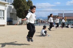 年長さんが卒園式の練習をした後、縄跳び大会をしました。写真を撮っていましたが、男子はあっという間に終了。縄跳びよりはサッカーなどに興味があったのかも。30秒賞(30秒間跳び続けられた)14人、1分間賞12人でした。男子は全員参加賞(お~?!)。