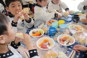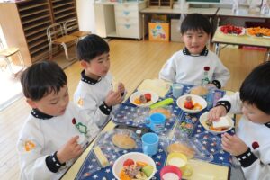 年長さんの給食は、卒園までの今日・明日の2日間。今日は、卒園をお祝いして、特別デザートのバイキングでした。プリンに、バナナ、みかん(せとか)、メロン、いちごから選んでトッピングも添えました。フルーツは完食でした。(★動画はインスタで★保育の見える化★)