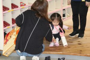 今年度(4月)からスタートした2歳児クラス(うさぎ組)の子どもたちがやって来ました。玄関で泣いた子もいましたが、大丈夫。部屋では楽しく遊んでいました。(2歳児クラスは定員まであと少し余裕があります。見学・お申込みをお待ちしています。)