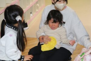 今年度(4月)からスタートした2歳児クラス(うさぎ組)の子どもたちがやって来ました。玄関で泣いた子もいましたが、大丈夫。部屋では楽しく遊んでいました。(2歳児クラスは定員まであと少し余裕があります。見学・お申込みをお待ちしています。)