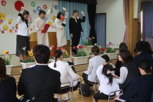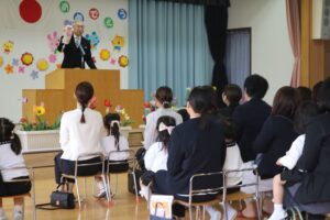 年少児36名、年中児4名の入園式を行いました。年少さんは、昨年度に満3歳保育で来ていた子も多く、全体として落ち着いていました。年少さんは、明日から、赤帽子かピンク帽子を被って、元気にやってきてね。朝、園長先生の手がトラなら優しく「ガブッ」とするよ。ネコならタッチしに来てね。(★動画はインスタで★保育の見える化★)