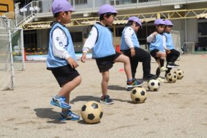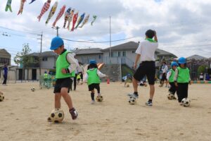こいのぼりの季節、到来です。今までに年長さんがつくってきた こいのぼりを今年はじめてあげました。そして、こいのぼりの下、年長さんのサッカー教室も第1回目でした。高校のサッカーの先生や部員さんが来てくれました。年少さん、プレ年少さんらの園庭での遊びもスタート。「みんな、元気に遊ぼうね」